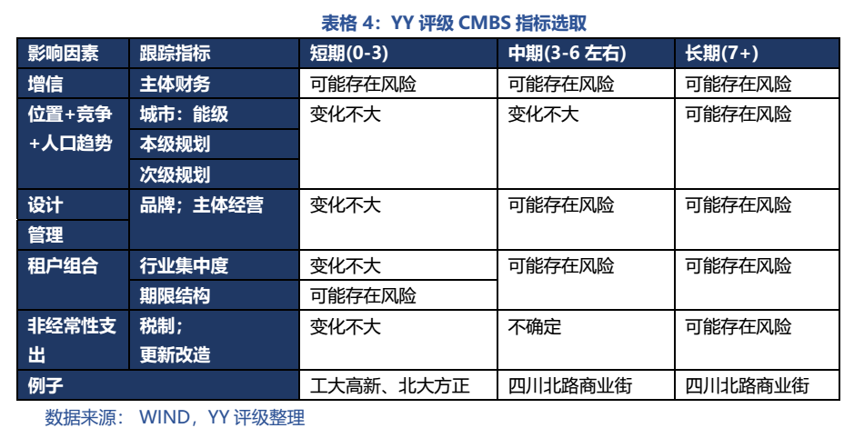 概括而言,表4的指標設計成維度定性跟蹤指標,即主體財務以反映增信風險、主體經營(品牌)以反映設計和管理風險、各級城市規(guī)劃也反映位置+競爭+人口趨勢問題以及用行業(yè)分布、期限結構來跟蹤租戶組合風險,同時關注一些可能的非經常性支出問題,如稅制改革(房地產稅)和更新改造需求(五角場萬達為10年左右后改造)。