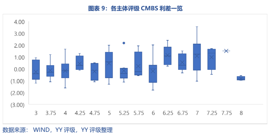 整體而言,取CMBS實際發(fā)行主體相近時間發(fā)行的3年期左右公司債或中期發(fā)行票面利率 – CMBS發(fā)行票面利率所得利差,體現CMBS的抵押和增信措施對債項的增信效果(或至少一級投資者認可的增信效果),一般而言>0的程度越高表示資產的增信程度越好。