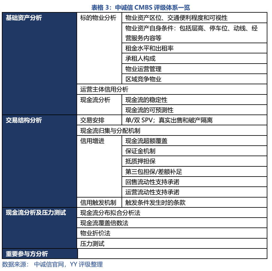 中誠信的商業(yè)物業(yè)抵押貸款結構化產品評級體系如表3所示,大致分為基礎資產分析、交易結構分析、現金流分析及壓力測試以及重要參與方分析上。