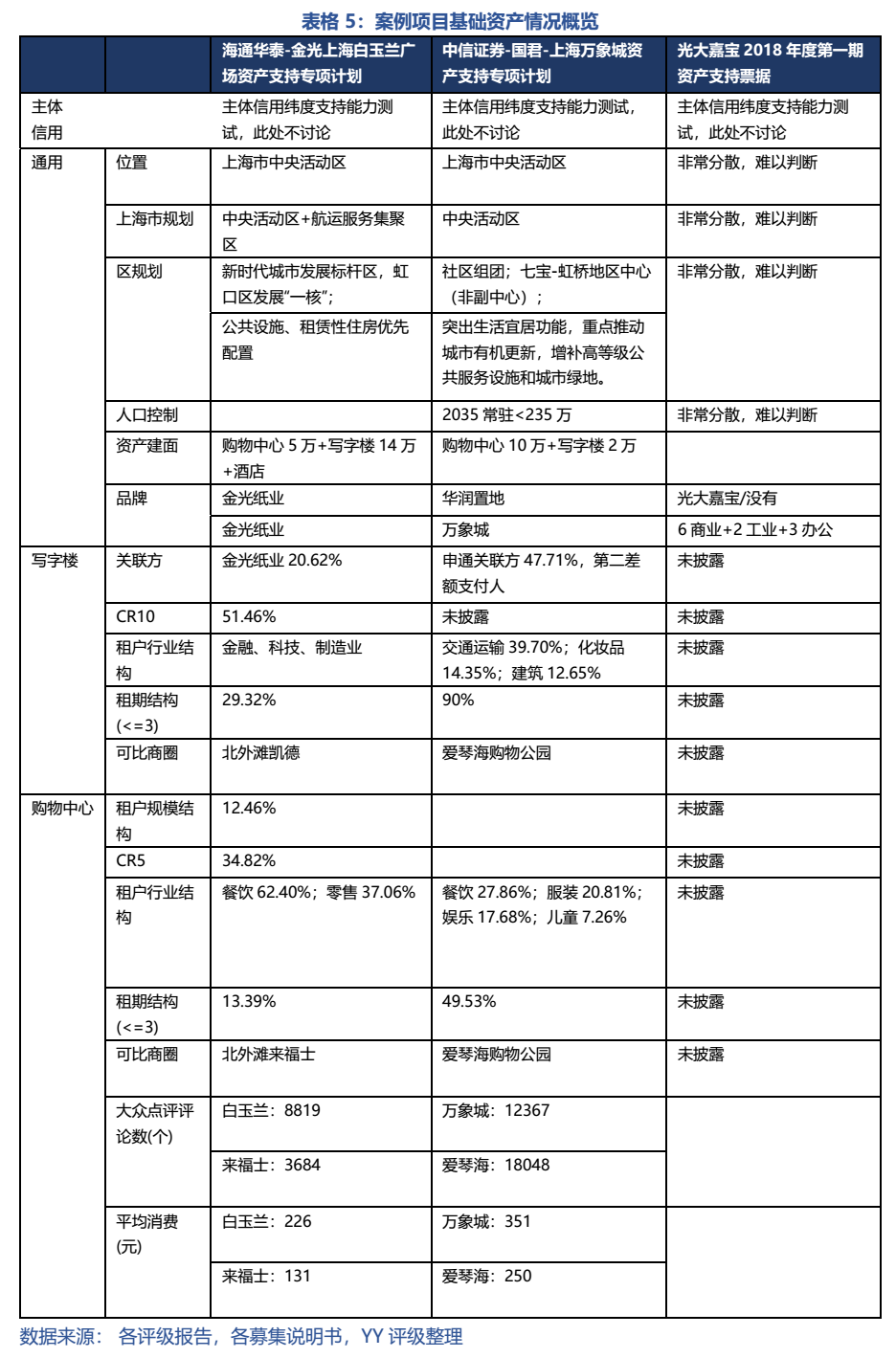 因此,從基礎資產增信的角度,我們認為金光白玉蘭中短期增信可能尚可,但隨著北外灘的開發(fā)和各種公共基礎設施的建設將越來越好;而華潤萬象城的中短期增信尚可,但長期看來需要考慮其區(qū)域定位僅為閔行次優(yōu)(低于2城市副中心)的風險;光大嘉寶的資產非常分散,但相應的資產規(guī)模很小且分散,資產清償、主體償還壓力尚可,因此增信水平應一般。但若以白玉蘭的租金增速估計為錨,則萬象城和光大嘉寶的租金增速預期可能偏樂觀。