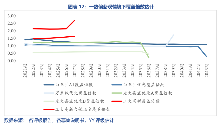 如圖14可見,在租金和出租率都偏悲觀(樂觀不消說除最后一期外都是足額的)的情況下,白玉蘭對A1級本息覆蓋倍數也一直保持在1以上,2027年開始對優(yōu)先A2級利息覆蓋不足,但也在0.95以上,但無法保障A2級本金償還;萬象城只有一層優(yōu)先級,悲觀預期下2024年開始優(yōu)先級本息覆蓋倍數小于1,但也一直處于0.9以上;光大嘉寶對優(yōu)先A級保障程度較好,但對優(yōu)先B級幾乎肯定無法覆蓋本息,必然依賴主體信用;工大高新在考慮不考慮保證金的情況下覆蓋倍數都較好,考慮保證金的情況下覆蓋倍數更是達到了2左右。