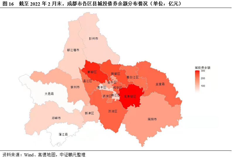 成都市債券發行下沉較為明顯,存續債集中在二圈層區縣和“東進”“北改”規劃區縣。從行政級別來看,省級、地市(州)級、區縣級城投平臺發債余額占比分別為17.0%、43.7%和39.3%,區縣級城投主要集中在成都市下轄區,體現其區縣級城投具有一定市場認可度,區縣級城投存續債余額占全市比例達77.9%;主要集中在“二圈層”區縣和納入成都“東進”“北改”戰略規劃的金堂縣、青白江、簡陽市等,其中龍泉驛和郫都區為前兩大存續債區縣,余額均在300億元左右,占全市比例在6.5%左右;高新區和天府新區城投平臺分別發債259億元和200億元,占比分別為5.8%和4.5%。
