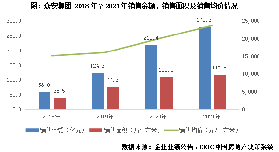 全年實現銷售額272.3億元,銷售回款292億元。根據企業公告數據,2021年眾安集團實現全口徑銷售額279.3億元,銷售面積117.5萬平方米,分別同比增長27.3%及6.9%。相較于百強房企-3%的負增長而言,企業的銷售成績表現較為亮眼。面對復雜多變的環境,公司緊抓回款,全年共實現銷售回款292億元,回款率高達104.6%,幫助企業維持現金流健康。