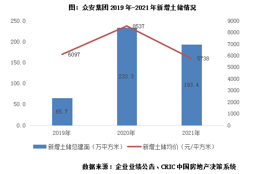 【立足浙江投資積極,未來2年壓降投資規模】2021年眾安集團共新增12個項目,新增土儲總建面193.4萬平方米,新增土儲總價111.0億元,全年拿地銷售比約0.40,高于百強平均的0.25。未來秉持短期審慎,長期樂觀戰略投資,2021年全年眾安集團新增土儲總貨值約280億元,未來3年新增貨值保持在160億/220億/450億元左右。