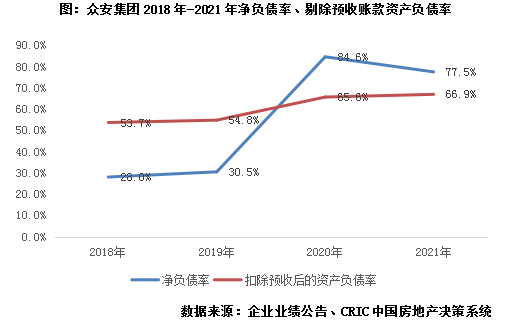 【結轉不暢致營收下降,2021年凈利率僅0.8%】2021年眾安集團實現營業收入49.7億元,其中地產銷售收入由于結轉時間的影響為42.8億元,同比下降36.6%,是企業營收下降的主要因素。酒店經營、商業租賃及物業管理等多元化業務收入約6.9億元,整體與2020年持平。關于地產結轉問題,業績會上管理層預期2022年會有修復,全年結轉收入會在100億以上。2021年眾安集團實現整體毛利潤約14.8億元,整體毛利率約為29.7%,相較2020年略降0.5個百分點。根據管理層透露,未來企業毛利率將會持續維持在30%的水平。全年凈利潤僅0.39億元,凈利率0.8%。