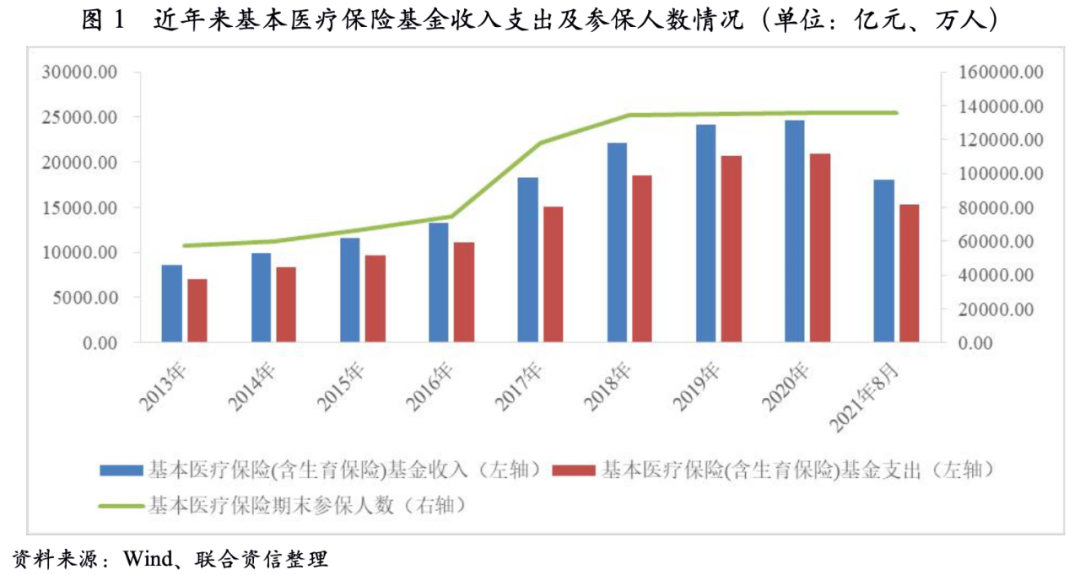 從醫藥行業下游支付能力來看,醫保基金作為最重要的支付方,其支付額約占整體醫療衛生總費用的約40%,醫保基金的支付能力直接決定了醫藥行業的回款情況。根據國家醫保局數據顯示,2020年,全國基本醫保基金(含生育保險)總收入為2.46萬億元,同比增長0.08%;全國基本醫保基金(含生育保險)總支出為2.09萬億元,同比變化不大,年末醫保基金累計結余3.14萬億元。2021年1-10月,全國基本醫保基金(含生育保險)總收入為2.46萬億元,全國基本醫保基金(含生育保險)總支出為1.90萬億元。