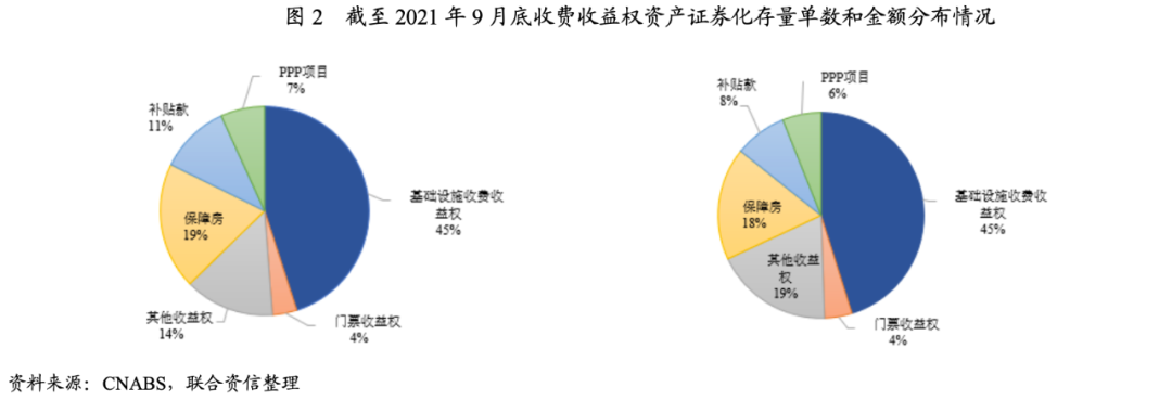 截至2021年9月底,處于存續(xù)期內(nèi)的收費(fèi)收益權(quán)項目共463單,存續(xù)金額合計3871.68億元。從存續(xù)的收費(fèi)收益權(quán)項目的底層資產(chǎn)類型來看,截至2021年9月底,基礎(chǔ)設(shè)施收費(fèi)收益權(quán)占比最高,其次為保障房項目,具體如下圖所示。