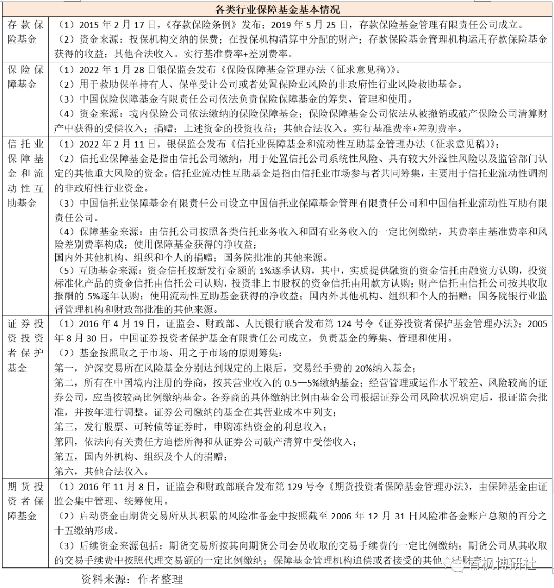 (一)目前國內已有存款保險基金、保險保障基金、證券投資者保護基金、信托業保障基金、流動性互助基金、期貨投資者保障基金等諸多行業性保障基金,在各細分金融行業救助方面起到了重要作用。以上行業保障基金的共性如下: