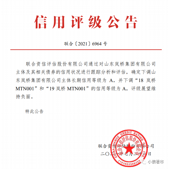 7月30日,聯合資信公告稱,將山東嵐橋集團有限公司(以下簡稱“嵐橋集團”)主體長期信用等級由AA下調為A,將“18嵐橋MTN001”和“19嵐橋MTN001”的信用等級由AA下調為A,評級展望維持負面。