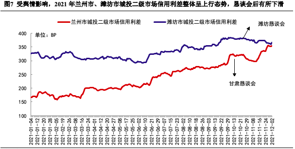 此外,2021年多個地級市主要平臺出現信用輿情事件。例如在蘭州地區(qū)地級市平臺風險事件連續(xù)發(fā)酵,2021年8月蘭州交通發(fā)展建設集團有限公司在中登網上被登記為融資租賃展期(后解釋為融資租賃公司登記有誤),且區(qū)域內多家平臺均有債券取消發(fā)行情況,受此影響,蘭州市城投二級市場信用利差持續(xù)走高。后為化解債務信用危機,甘肅省地方金融監(jiān)管局于2021年10月召開投資者懇談會,提出“針對國有企業(yè)存續(xù)債券,省市兩級堅決采取過硬措施,全力推動風險化解,堅決守住不發(fā)生系統性風險的底線?!钡@一系列舉措暫未見明顯效果,蘭州市城投二級市場信用利差短暫下跌后進一步上行。