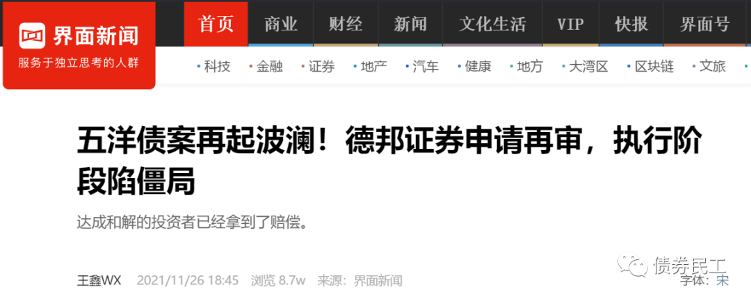 根據(jù)界面新聞2021年12月20日的報(bào)道,最高人民法院于12月13日駁回了德邦證券的“五洋債”再審申請(qǐng)。