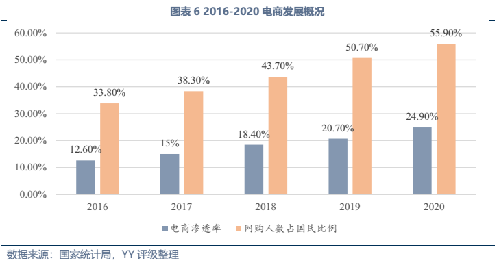 發(fā)展趨勢方面,傳統(tǒng)工業(yè)物流業(yè)務(wù)量上增長空間不大,未來的發(fā)展大方向仍為降本增效(近幾年我國社會物流費(fèi)用/GDP徘徊在14.7%左右,較美國8%還有較大距離),同時(shí)物流企業(yè)通過向供應(yīng)鏈一體化延伸、提供附加服務(wù)來挖掘新的利潤空間,與貿(mào)易、供應(yīng)鏈類企業(yè)的邊界日漸模糊。而居民快遞領(lǐng)域,業(yè)務(wù)量上還有較大增長空間,其需求受電商滲透率、網(wǎng)購人數(shù)占國民比例影響,截至20年末我國電商滲透率24.9%、網(wǎng)購人數(shù)占比55.9%,還有較大增長空間,且網(wǎng)購的品類還在持續(xù)擴(kuò)大。
