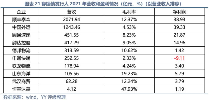 信用債市場方面,上市公司中高頻出現(xiàn)的“多式聯(lián)運(yùn)”、“智慧物流”、“供應(yīng)鏈管理”等概念在發(fā)債主體中熱度不高,主要仍以傳統(tǒng)物流企業(yè)為主。截至22年3月末,YY行業(yè)為物流的存續(xù)債主體共有16家,債券余額合計(jì)為402.88億元。行業(yè)整體毛利率不高(平均13%),杠桿率偏低(平均資產(chǎn)負(fù)債51.3%)。資質(zhì)方面,貨代龍頭中國外運(yùn)信用資質(zhì)最好,中鐵鐵龍集裝箱背靠國鐵集團(tuán)資源,信用資質(zhì)也較好。快遞細(xì)分領(lǐng)域集中度較高,市場格局相對穩(wěn)定,也有較強(qiáng)的經(jīng)營獲現(xiàn)能力支撐,順豐、韻達(dá)、圓通信用資質(zhì)尚可,申通快遞盈利較差,資質(zhì)稍弱。濟(jì)寧港航梁山港、珠海恒基達(dá)鑫、重慶龍頭港等工業(yè)品物流企業(yè)信用資質(zhì)較弱。