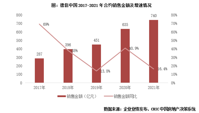 債務指標優化,剔預資產負債率降至監管線以下。根據企業公告,截至2021年底,德信的凈負債率為63%,相較2020年底下降,剔除預售賬款后資產負債率為69.6%,成功降至監管標準的70%以下,達到監管要求。