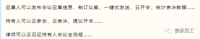 更為關(guān)鍵的是,債券持有人、發(fā)行人、律師、受托管理人、信用增進(jìn)機(jī)構(gòu)和信用評(píng)級(jí)機(jī)構(gòu)等均可以通過(guò)持有人會(huì)議管理系統(tǒng)參會(huì),實(shí)現(xiàn)了債券各利益相關(guān)方的全面參會(huì),能夠更好地保障各方的利益。