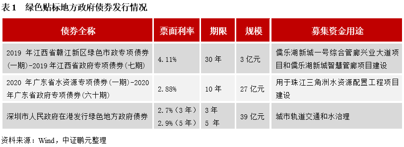 截至目前,我國發(fā)行的明確貼標(biāo)“綠色”的地方政府債券僅3只,其中1只為在香港債券市場發(fā)行。2019年6月18日,江西省贛江新區(qū)發(fā)行首單貼標(biāo)綠色市政債券,首期發(fā)行規(guī)模3億元,期限30年,募集資金用于儒樂湖新城一號綜合管廊興業(yè)大道項目和儒樂湖新城智慧管廊項目建設(shè),經(jīng)獨立第三方機構(gòu)進行發(fā)行前評估認(rèn)證,募投項目屬于節(jié)能類項目,給予綠色貼標(biāo)。2020年5月12日,廣東發(fā)行了資金用于水資源配置工程的、經(jīng)第三方機構(gòu)進行發(fā)行前評估認(rèn)證的綠色地方政府債券。2021年10月12日,深圳在香港聯(lián)合交易所發(fā)行3年期15億元、5年期24億元綠色地方政府債,募集資金將用于城市軌道交通和水治理等項目,是境內(nèi)首個地方政府到香港發(fā)行離岸人民幣地方政府債券。