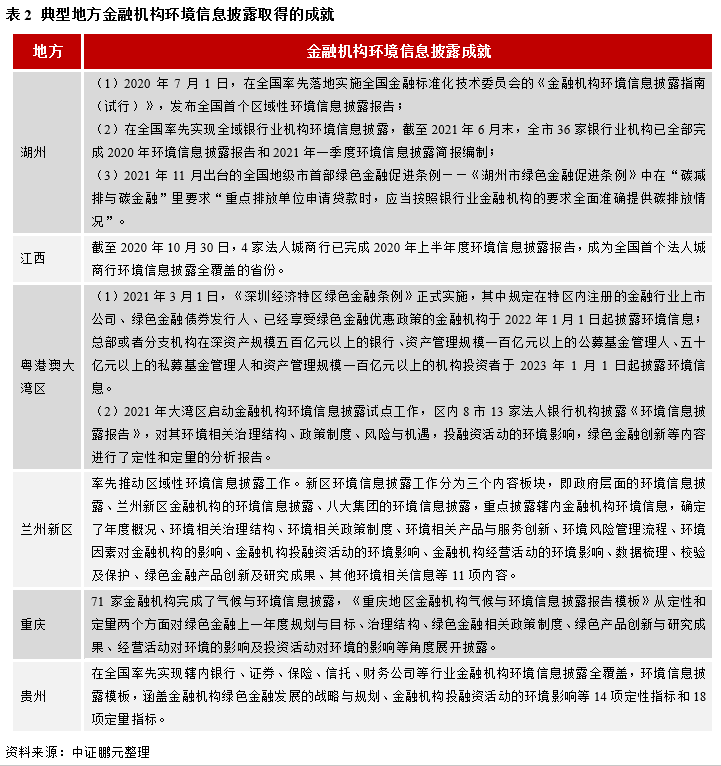 我國地方政府在綠色金融發(fā)展中發(fā)揮了“引擎”作用,一些地方政府在促進當(dāng)?shù)鼐G色金融發(fā)展方面做了很多努力,也制定了一系列優(yōu)惠激勵政策,驅(qū)動著當(dāng)?shù)鼐G色金融的發(fā)展。尤其是6省9地綠色金融改革創(chuàng)新試驗區(qū)的地方政府,他們的綠色金融發(fā)展在全國處于領(lǐng)先地位。更重要的是,一些地方金融機構(gòu)在綠色金融產(chǎn)品創(chuàng)新、環(huán)境信息披露方面都積累了寶貴經(jīng)驗,這其中,銀行的綠色金融參與度是最高的,截至2021年6月末,全國有7家“赤道銀行”,分別為興業(yè)銀行、江蘇銀行、湖州銀行、重慶農(nóng)村商業(yè)銀行、綿陽市商業(yè)銀行、貴州銀行、重慶銀行。環(huán)境信息披露方面,目前湖州、蘭州新區(qū)、重慶、貴州等地已經(jīng)實現(xiàn)區(qū)域內(nèi)銀行等金融機構(gòu)環(huán)境信息披露,環(huán)境信息涵蓋了金融機構(gòu)環(huán)境相關(guān)治理結(jié)構(gòu)、自身經(jīng)營活動的環(huán)境影響和投融資活動的環(huán)境影響等。