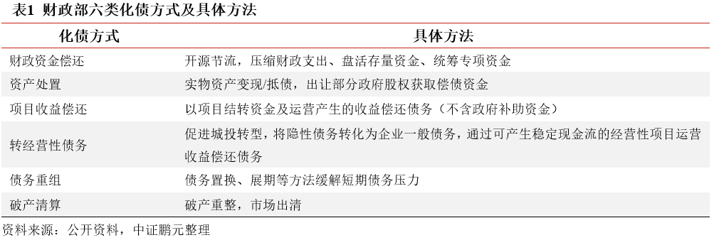 我國地方政府顯性債務融資規范,償債計劃安排相對明確,當前償債壓力主要集中于隱性債務。對于隱性債務化解,財政部文件提出六項化債方式,包括財政資金償還、資產處置、項目收益償還、轉經營性債務、債務重組和破產清算,各項方式具體方法如下表所示: