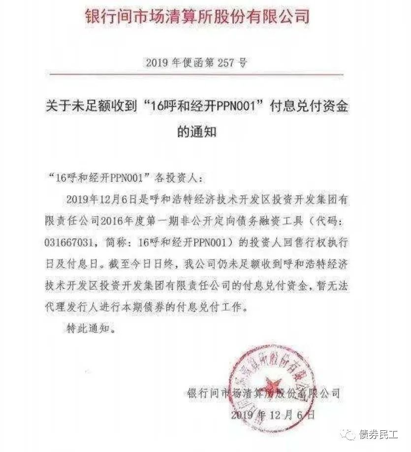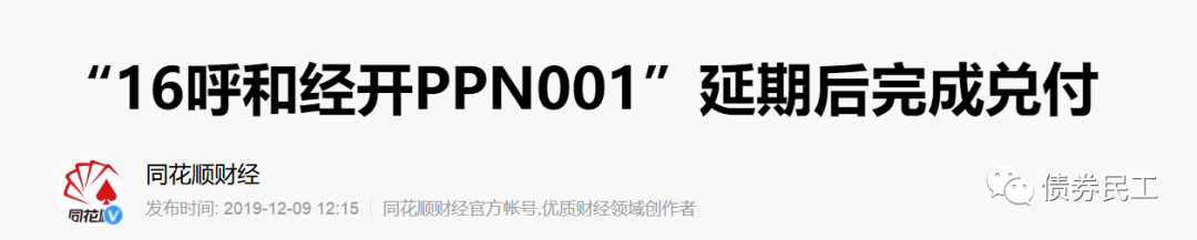 根據(jù)公開(kāi)信息,2019年12月9日,“16呼和經(jīng)開(kāi)PPN001”在經(jīng)過(guò)一個(gè)周末的技術(shù)性違約之后,最終以陸續(xù)兌付。