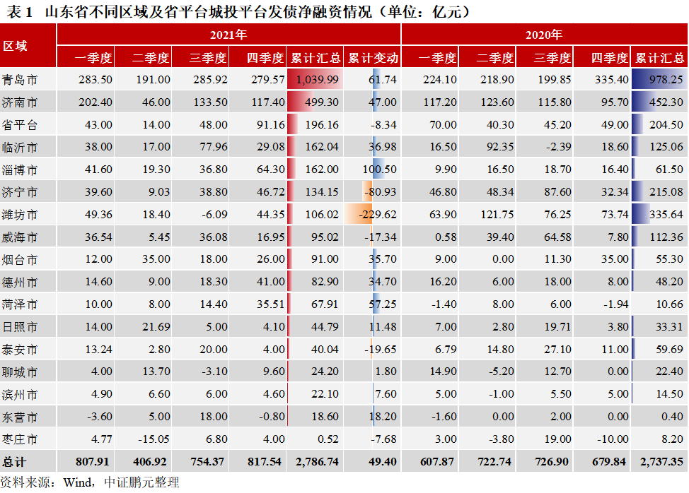 山東省2021年城投債發債總量保持增長,區域分化明顯。2021年山東城投發債規模和凈融資額均較2020年有所增加但增速放緩,同時季度波動明顯。