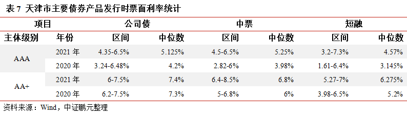 融資利率整體區間上移,區域信用利差走闊。以公司債、中票和短融產品為例,2021年天津市AAA和AA+主體融資利率中位數均有不同程度提高,其中AAA主體融資利率區間上移較多,銀行間產品發行利率中位數增加超過100bp。2021年天津市4家AA+主體發行的6支債券票面利率超過7.5%(含),4支債券由北辰區兩家主體發行,票面利率最高為8.5%。利差方面,2021年初天津市AAA債券信用利差走闊,AA+債券信用利差近年持續維持高位,隨著天津市政企對債務償還重視程度提升,預計AAA主體利差攀升勢頭將有所緩和,但短期內區域利差收窄可能性較低。