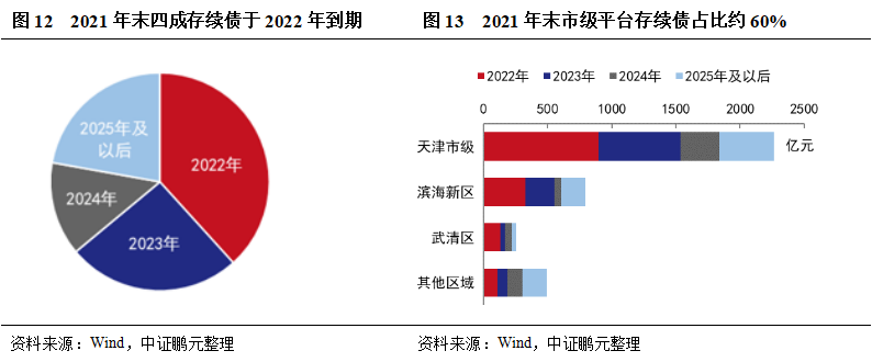 區域凈融資收縮,一級發行向AAA主體集中且期限結構短期化。2021年天津市僅靜海區、武清區、西青區凈融資為正,全市7家AAA主體融資規模占當年債券融資比重合計80%,當年短期融資券發行占比近75%,較2020年提高32個百分點。截至2021年末,天津市四成存續債于2022年到期,除市本級外,濱海新區、武清區、津南區和寶坻區過半存續債需在2023年前償付,短期債務集中度高。