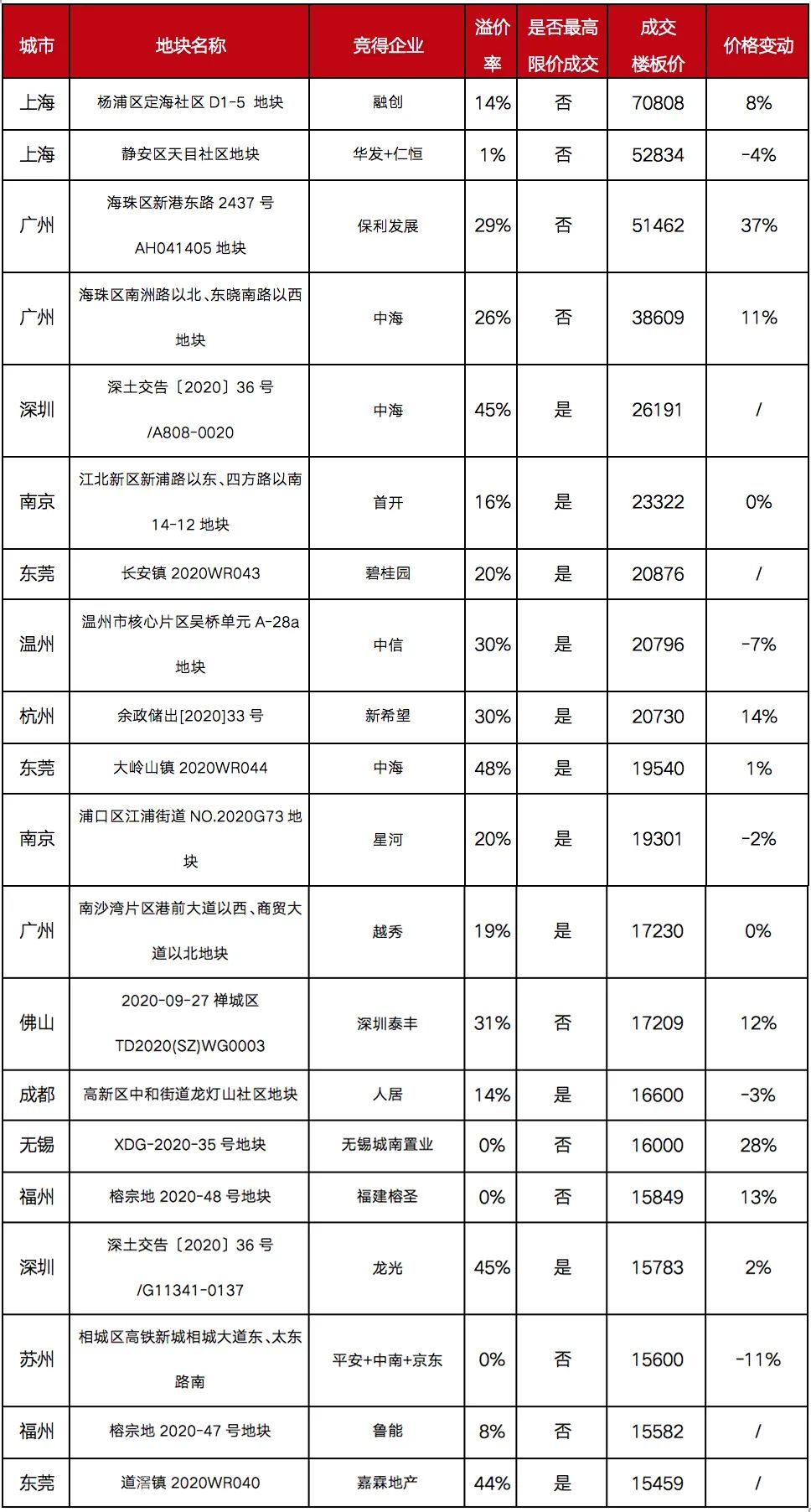 從溢價率來看,10月份以來成交單價TOP20地塊中有12宗地以最高限價成交或成交溢價率超過30%,廣州海珠琶洲地塊、東莞長安地塊甚至創下了片區最高樓面單價紀錄。