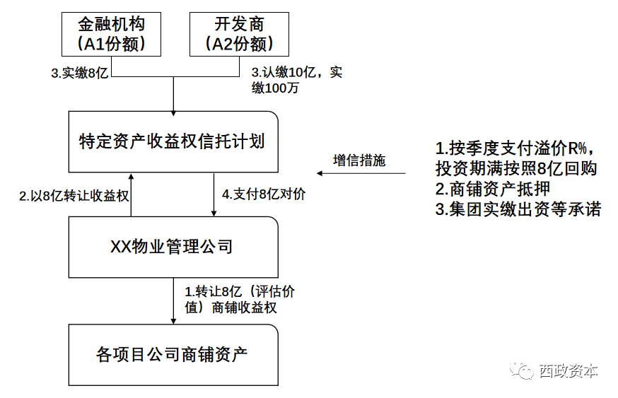 以上述產品架構為例,項目公司把未售商鋪的收益權轉讓給物業管理公司,并簽署《商鋪收益權轉讓協議》;物業管理公司將商鋪收益權轉讓給信托計劃,并與信托計劃簽署《特定資產收益權轉讓及回購協議》,其中約定由物業公司負責對商鋪進行銷售和經營,支付固定回報,并承諾到期后回購商鋪收益權;信托計劃到期后,信托計劃管理人可發繳款指令給開發商追加資金,用于回購商鋪及收益權,也即信托計劃到期后無法退出時,開發商需就認繳的份額完成資金的實繳,由此保障信托計劃的退出。