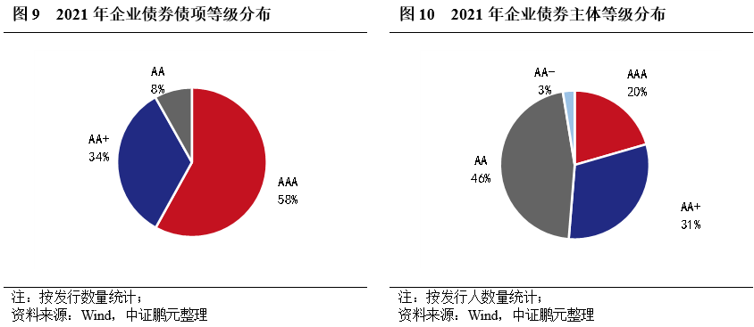 2021年發行的企業債主體信用等級以AA級為主,AA+及以上的高級別品種數量占比51%,較上年上升3個百分點。其中,AAA級主體87家,占比20%;AA+級主體98家,占比29%;AA級主體185家,占比46%,AA-級主體12家,占比3%。