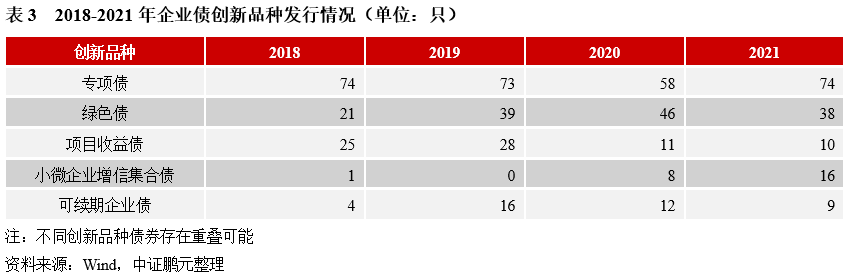 2021年企業債創新品種合計144只,較上年增加14只,占比29.3%,較上年下降4.3個百分點。第一,發改委專項債是企業債市場主要創新品種,在全市場占比約15%。其中,停車場建設專項債券37只,是專項債主要品種;縣城新型城鎮化建設專項債券14只,為新增的專項債創新品種;另外,農村產業融合發展專項債券8只,較往年明顯增長,而地下綜合管廊建設專項債券本年發行4只,較往年出現明顯下降。第二,小微企業增信集合債受政策推動,2021年發行數量增長100%。主要由地級市城投公司發行,2018年來,共有12家地級市城投公司發行14只小微企業增信集合債,占比56%。第三,綠色債受政策推動,2018年來呈現增長,2021年數量有所減少?!疤歼_峰、碳中和”目標的提出,進一步推動了綠色金融的發展,2021年綠色債券發行規模3720.85億元,較上年增長115%。其中,綠色企業債發行38只,較上年下降17%。與其他債券品種的快速增長有關。