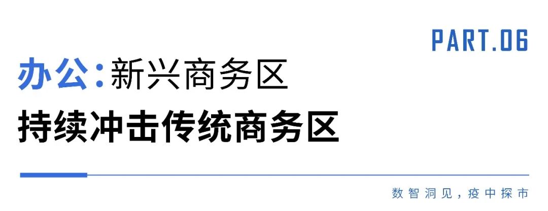 CAIC數據顯示,近年來新興商務區一支獨秀,持續沖擊傳統商務區,疫情極大加速了這一過程。