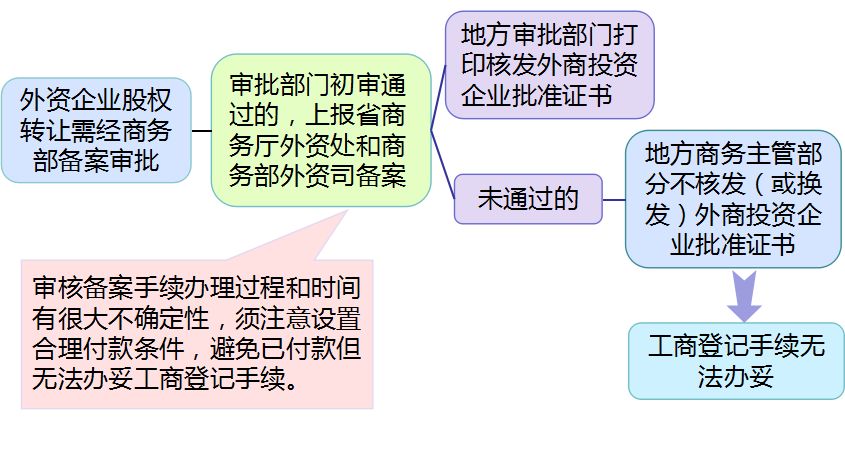 在收購?fù)赓Y企業(yè)、國有企業(yè)的股權(quán)時要特別關(guān)注股權(quán)轉(zhuǎn)讓手續(xù)的辦理程序,避免因辦理不了股權(quán)轉(zhuǎn)讓手續(xù)而導(dǎo)致收購方投入大量資金卻在法律上對目標(biāo)公司沒有任何權(quán)利。