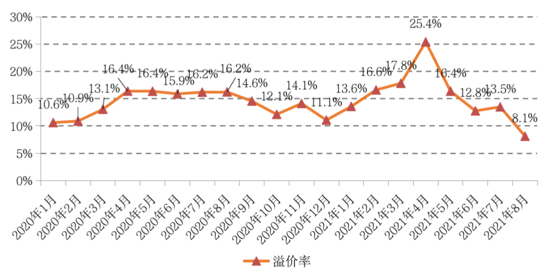 值得注意的是,由于熱點(diǎn)城市在8月紛紛迎來(lái)溢價(jià)、地價(jià)的管控,加之優(yōu)質(zhì)地塊成交占比明顯減少,地市場(chǎng)溢價(jià)率較上月大幅下滑,8月環(huán)比減少5.4個(gè)百分點(diǎn),降至8.1%,創(chuàng)下2020年以來(lái)的最低值。