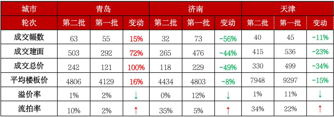 表:青島、濟(jì)南和天津2021年兩次集中土拍熱度對(duì)比(萬(wàn)平方米、億元、元/平方米)