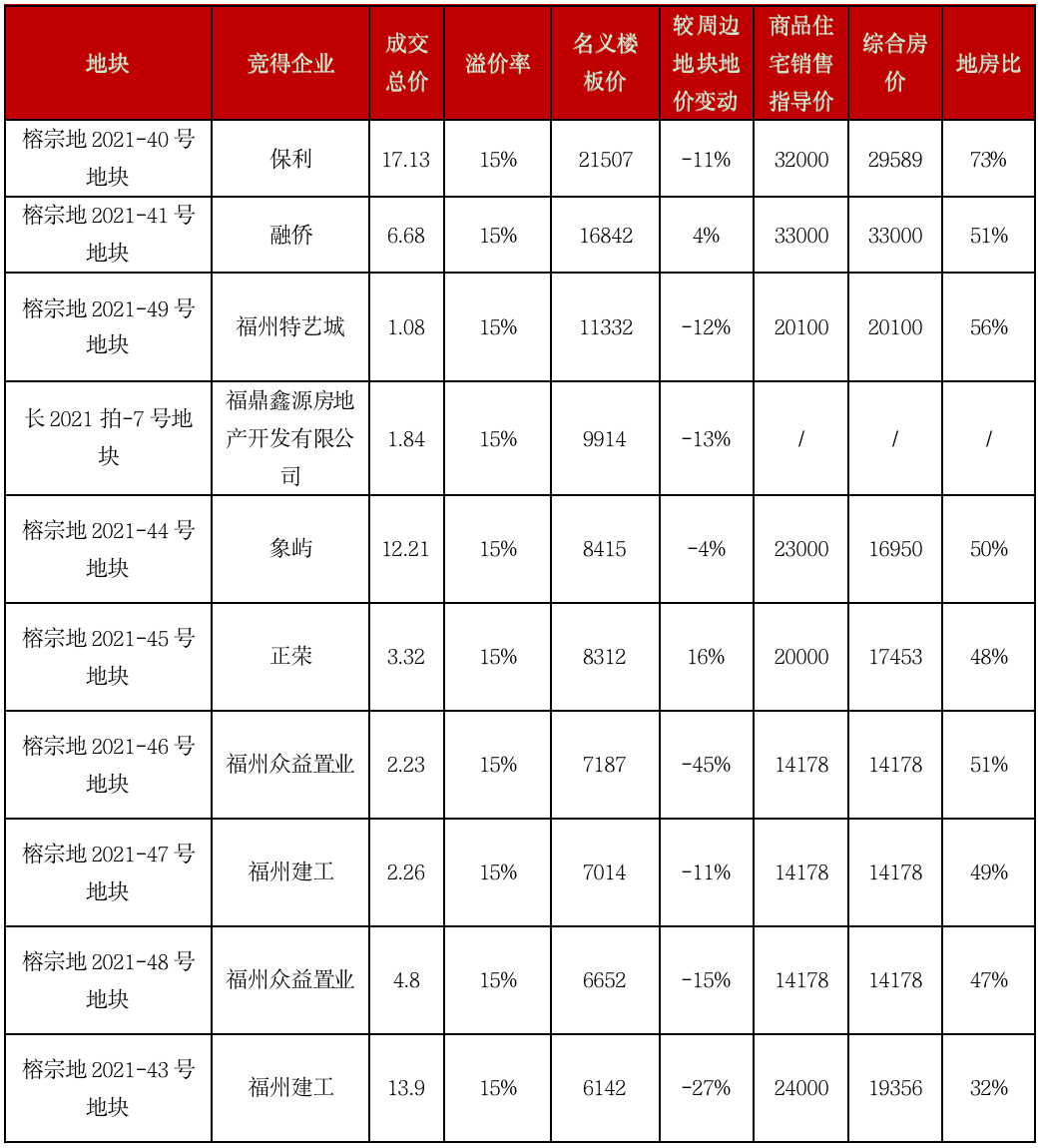 即便是熱門(mén)晉安區(qū)紅光村地塊,尚有一定盈利空間。該地塊共吸引10余家房企參拍,開(kāi)拍即觸及最高限價(jià)進(jìn)入搖號(hào)環(huán)節(jié),最終保利以17.13億+搖號(hào)競(jìng)得,平均樓板價(jià)高達(dá)21507元/平方米,也是本場(chǎng)土拍中樓板價(jià)最貴的地塊。該地塊還要配建2萬(wàn)平方米人才限價(jià)商品房(價(jià)格為商品住宅備案價(jià)格的70%),按照商品住宅銷(xiāo)售指導(dǎo)價(jià)為32000元/平方米綜合測(cè)算,地房比為73%,房地差超8000元/平方米,也不算“無(wú)利可圖”。
