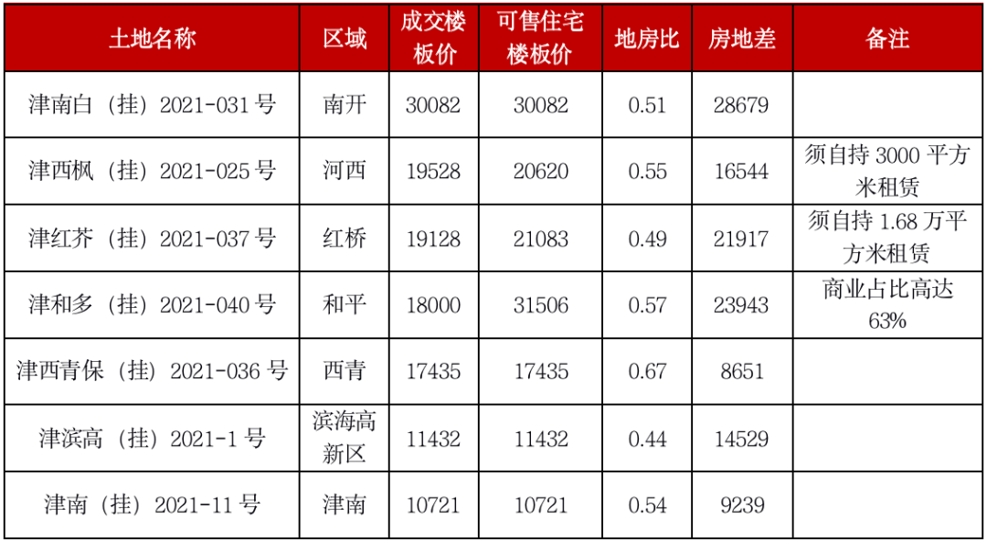 舉個(gè)例子,本輪成交樓板價(jià)超過(guò)1萬(wàn)元/平方米的高價(jià)地中,7宗地,僅有1幅地的地房比超過(guò)0.6,其余地塊的地房比都在0.4~0.6之間。包括位于南開(kāi)中心區(qū)域的南開(kāi)區(qū)靈隱南里地塊,該地塊創(chuàng)下本輪成交名義地價(jià)最高,成交樓板價(jià)達(dá)3萬(wàn)元/平方米,但其周邊多為高端改善住宅項(xiàng)目,平均售價(jià)接近6萬(wàn)元/平方米,因此該項(xiàng)目的地房比僅有0.51,房地差也高達(dá)2.8萬(wàn)元/平方米,利潤(rùn)空間十分充足。