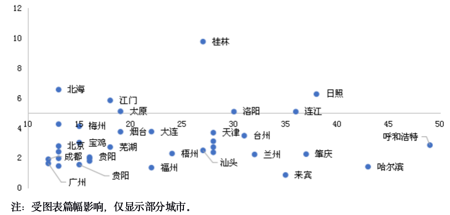 桂林、天津、洛陽、蕪湖等城,這一類城市土地消化周期均低于5年,但商品房消化周期均超過12個月,其中桂林、北海已升至40個月以上。