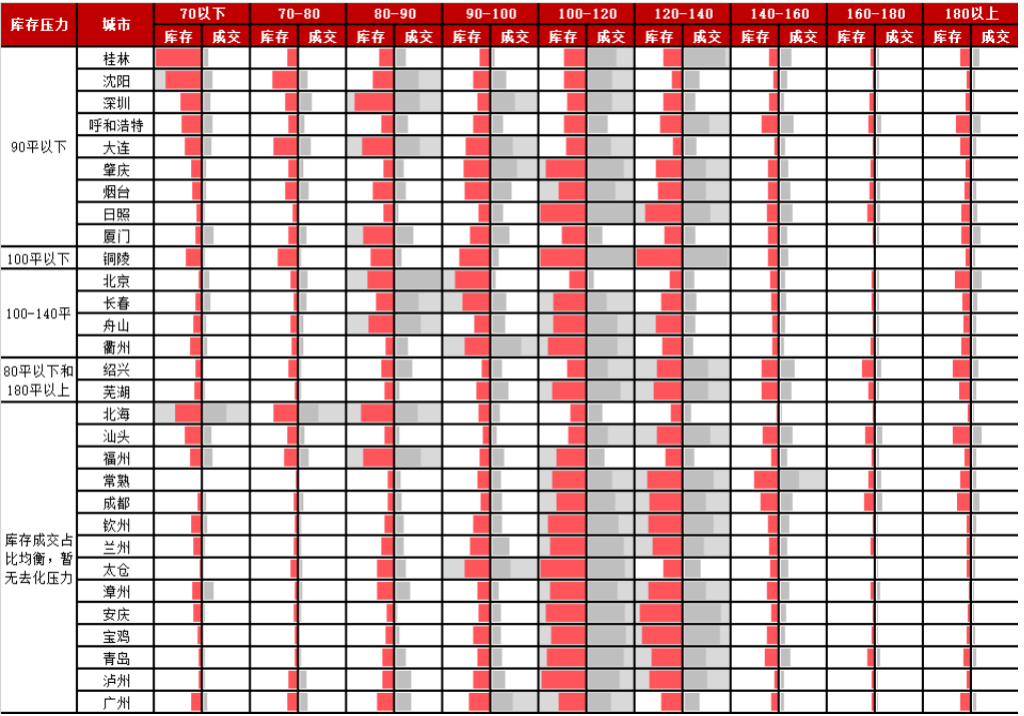 三四線城市的庫存壓力和二線城市基本類似,主要集中70平以下,70-80平和180平以上,對于多數三四線城市而言,目前房價雖然也漲到了階段性高點,但是整體的購房壓力還是不及核心一二線城市的,因而100-120平和120-140平成交占比也顯著高于核心一二線城市,這兩個面積段雖然庫存高企但后期基本不存在去化壓力,相較而言,小面積段缺乏足夠的吸引力,未來仍存在去化難題。