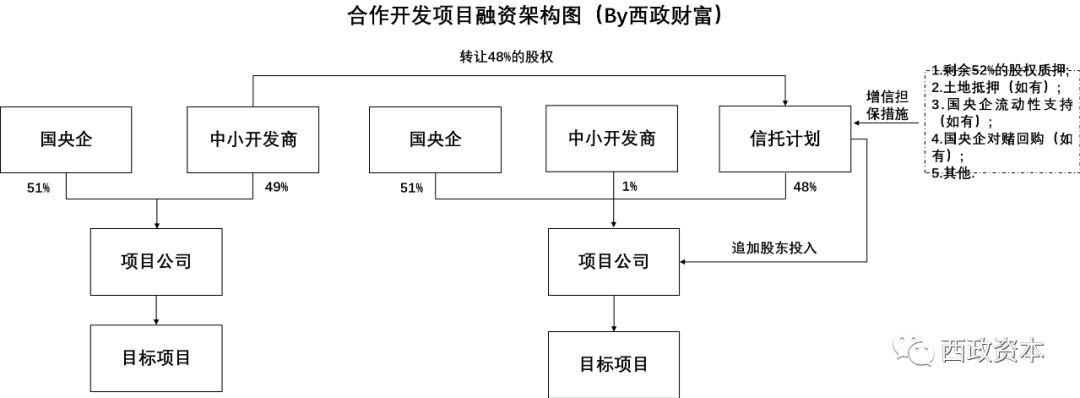 在上述銀行和信托對合作開發(fā)的小股東的融資產(chǎn)品中,我們能看到這些產(chǎn)品基本需要國央企(或大開發(fā)商)背書,因此在國央企無法提供背書的情況下,小股東(或中小房企)的融資難度依舊很大。為了解決這個(gè)問題,我們目前在做同類項(xiàng)目的時(shí)候一般是按如下思路進(jìn)行處理: