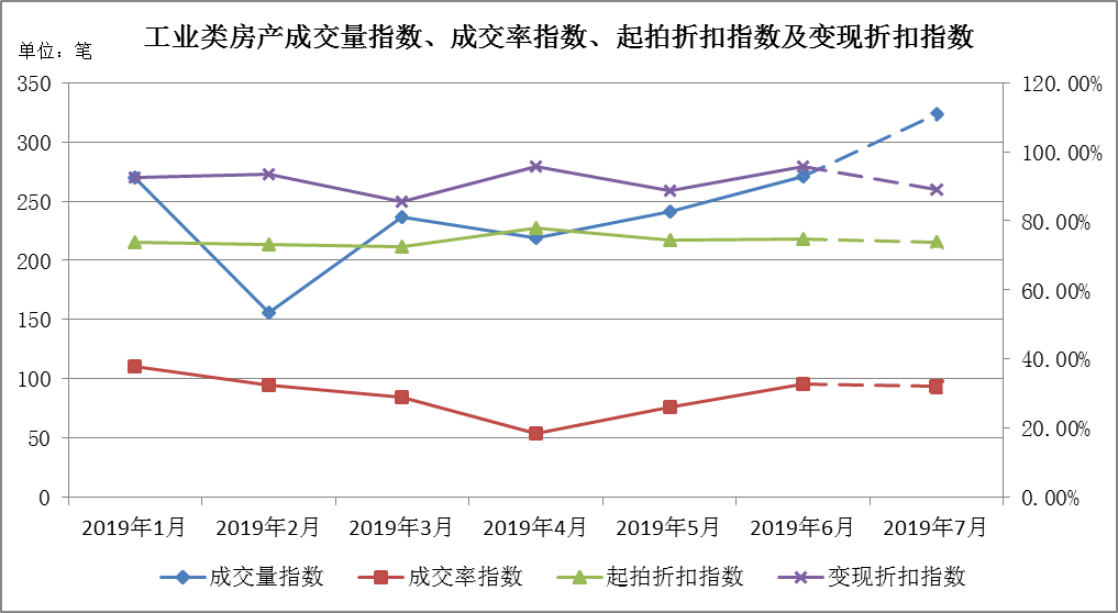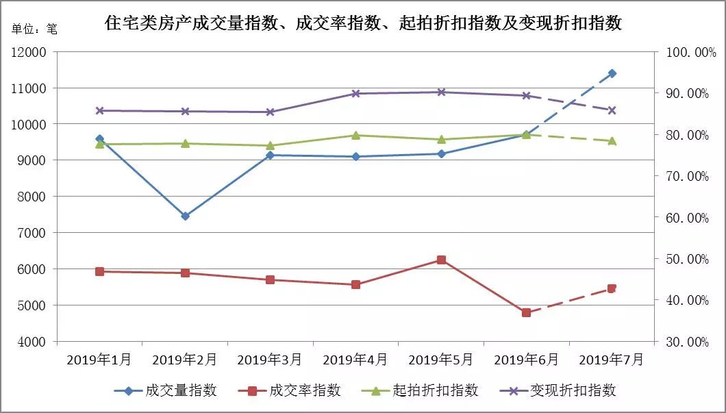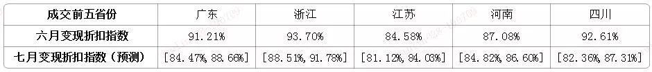 • 七月預(yù)測:成交量在299至348筆左右,成交率指數(shù)區(qū)間[30.56%,33.42%],起拍折扣指數(shù)區(qū)間[73.01%,74.64%],變現(xiàn)折扣指數(shù)區(qū)間[86.01%,91.91%]。