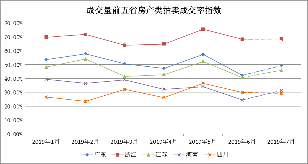 2019年1月至今,前五省的成交率趨勢較為一致,本月五省的成交率都有所下降,特別是廣東省,下降了近15個百分點。從今年整體趨勢來看,成交率從大到小排列依次為浙江、廣東、江蘇、河南、四川,江浙地區(qū)、珠三角地區(qū)經(jīng)濟發(fā)展水平較高,拍賣市場交易更為開放,拍賣成交的可能性也更大。