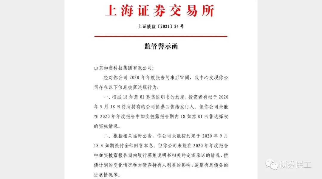 根據(jù)網(wǎng)站的公開信息,上海證券交易所于2021年5月16日向山東如意科技集團(tuán)有限公司(以下簡稱“如意集團(tuán)”)出具監(jiān)管警示函,主要原因是未能披露18如意01的回售情況和未能在2020年度報(bào)告中如實(shí)披露應(yīng)履行的信息披露義務(wù)。