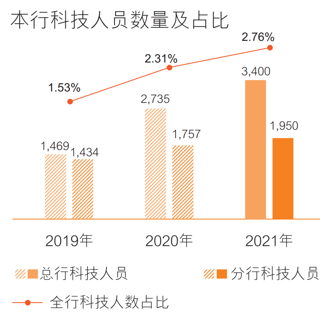在這些金融科技賦的背后,是郵儲(chǔ)銀行不斷加強(qiáng)科技人才隊(duì)伍建設(shè)。截至2021年末,郵儲(chǔ)銀行總行IT隊(duì)伍增加到3,400人,全行超過(guò)5,300人。其中,總行科技人員中,碩士及以上學(xué)歷占比高達(dá)65%。