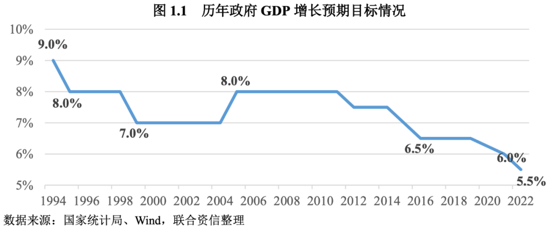 政府報告提出2022年GDP增長5.5%左右的增長目標,是近30年來最低的預期目標。歷史上看,自1994年在年初設定全年經(jīng)濟增長預期目標以來的近30年里,政府經(jīng)濟增長目標從最初的9%波動下調(diào)到了今年的5.5%,下調(diào)了3.5個百分點。其中1995年從上年的9%下調(diào)至8%,主要是在經(jīng)濟過熱,通脹形勢較為嚴重的情況下,國家主動調(diào)控降溫經(jīng)濟。1999年增速下調(diào)1個點至7%,則主要是受到亞洲金融危機的影響。唯一一次上調(diào)目標發(fā)生在2005年:在入世后平穩(wěn)高速增長的基礎上,為了抓住發(fā)展機遇期,實現(xiàn)更快平穩(wěn)增長,將增長預期目標由原來的7%上調(diào)為8%。從2012年到2016年,進入持續(xù)的單邊下調(diào)階段,增速目標下調(diào)了1.5個百分點至6.5%。也正是在這個時期,我國進入“三期疊加”的新發(fā)展階段,積極推進結構調(diào)整和增長動力轉換,注重生態(tài)環(huán)境保護和高質(zhì)量發(fā)展。2019年,在供給側結構性改革深入推進和中美貿(mào)易摩擦等因素影響下,經(jīng)濟下行壓力進一步增大,當年將增速目標設定為6%-6.5%。縱觀近30年來增速目標的下調(diào),有些是積極主動的宏觀調(diào)控,但更多是在內(nèi)外部環(huán)境壓力下所做的適應性調(diào)整。