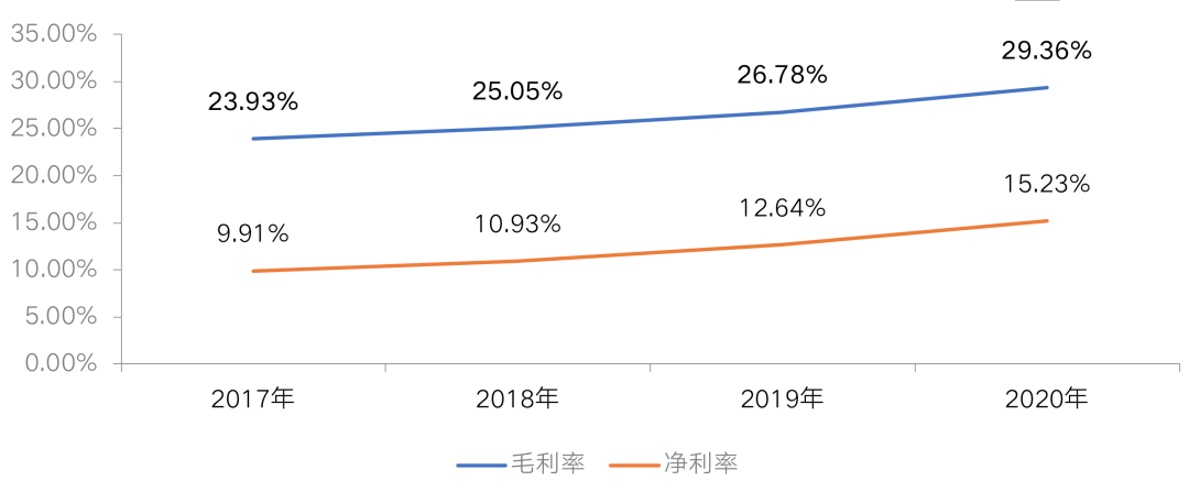 近年來,隨著整個房地產(chǎn)行業(yè)規(guī)模見頂,相比傳統(tǒng)地產(chǎn)開發(fā),物管行業(yè)現(xiàn)金流穩(wěn)健,經(jīng)營風險相對較低,同時盈利能力也較為穩(wěn)定。從目前上市的物管企業(yè)2017-2020年的加權(quán)平均毛利率和凈利率來看,近年來物管行業(yè)的毛利率和凈利率都保持著穩(wěn)步上升的態(tài)勢。與此同時,據(jù)CRIC監(jiān)測,2020年典型上市房企的毛利率下降4.8個百分點至24.3%,凈利率也已下降至10%。