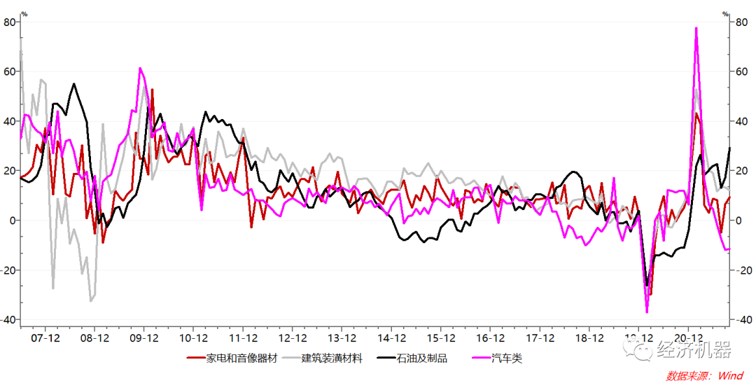 具體看,可選消費中,汽車和建筑裝潢保持疲弱,石油制品和家電增速改善。汽車消費下降,可能與供應鏈斷裂下的“芯片危機”有關,更反映了周期下行下的需求疲弱。建筑裝潢銷售額下降與近期地產市場快速惡化趨勢像吻合。石油及制品增速大幅上升,更多地是油價高企帶來的價格效應??紤]到汽車銷量的下降,剔除價格因素后,石油消費會弱的多(圖4)。