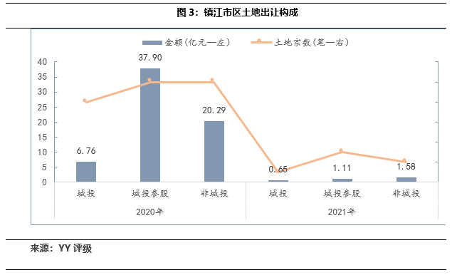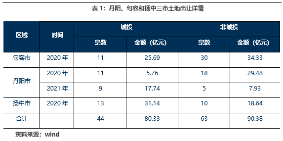 丹陽(yáng)市20年經(jīng)營(yíng)性土地出讓29宗,收入為35.24億元,其中城投規(guī)模11宗5.76億元,;21年出讓14宗,收入為25.57億元,其中城投規(guī)模9宗17.74億元,占絕大多數(shù);城投購(gòu)買主體以丹陽(yáng)高新投、丹陽(yáng)投資以及丹陽(yáng)經(jīng)開為主。