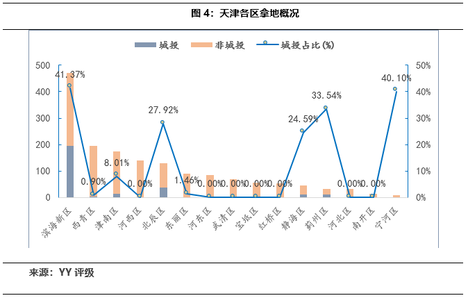 而具體到區(qū)域和明細(xì)而言,濱海新區(qū)土地出讓收入規(guī)模高,同時(shí)城投拿地占比在41.37%,遠(yuǎn)高于直轄市其他區(qū);從具體的明細(xì)而言,天津生態(tài)城投資拿地38宗,出讓金規(guī)模達(dá)114.79億元,占濱海新區(qū)城投拿地的59%左右。