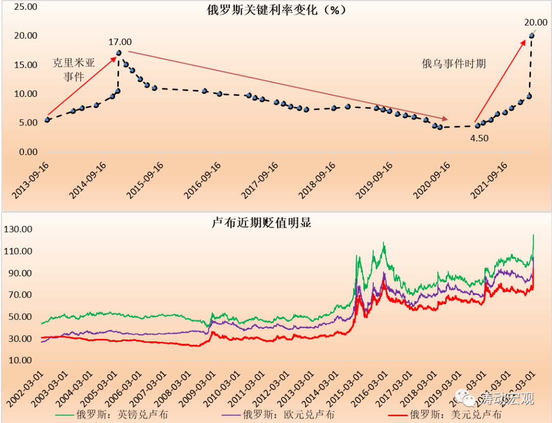 整體上看,我們認為,俄羅斯央行上調關鍵利率雖屬無奈之舉,但也算是必要舉措,但俄羅斯并不孤立,諸如烏克蘭、土耳其等經濟體也呈現也和俄羅斯一樣的無奈,即社會受內外環境影響而出現動蕩,本幣貶值與跨境資本流出壓力加大,資本在這些經濟體中需要有更高的風險對價。