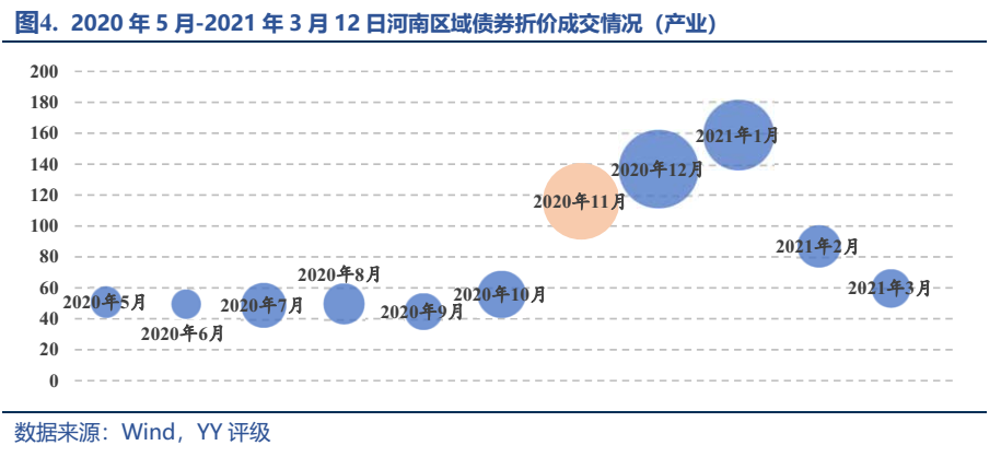 注:①縱軸為成交筆數,若單日內某只債券在多個市場多次成交,僅記為一筆成交,即單只債券日成交筆數不超過1筆;②氣泡大小為成交額;③折價成交以收益率高于8%來計算。
